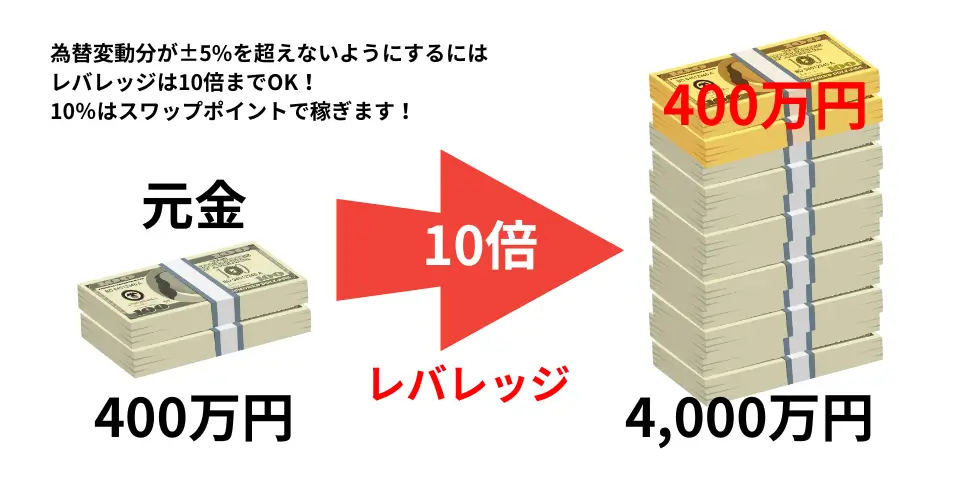 それでもレバレッジは10倍まではかけられるので、400万円の10倍の10%で年間400万円は確実にスワップポイントで稼いでいます。