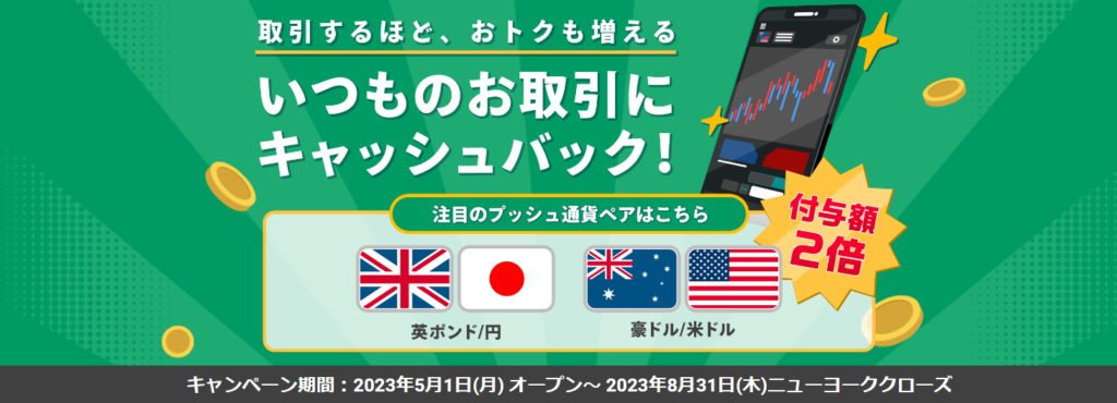 GMO外貨では、対象通貨ペアの新規約定でキャッシュバックが受け取れるキャンペーンを実施中です。キャンペーン期間は2023年1月4日から2023年8月31日までです。