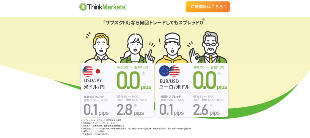 「ThinkMarkets」は月額費用を支払うことで、米ドル/円とユーロ/米ドルのスプレッドが「ゼロ」になる「サブスクFX」を提供しています。
