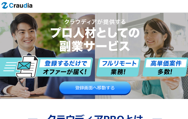 クラウディアPROは、専門スキルを活かして高単価・短時間・リモートで働ける副業マッチングサービスです。時給5,000円以上の案件や週5時間からの柔軟な働き方に対応し、登録スキルに応じた特別オファーも届きます。自身のスキルを活かし高単価な副収入を得たい方におすすめです。