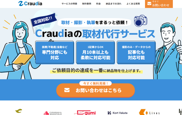 北海道から沖縄まで全国取材・撮影に対応する取材代行サービス。医療・金融等の専門分野を含む年間400件超の実績と200名超のライター・カメラマン体制で、社員インタビュー・導入事例・セミナーレポートなど多彩なコンテンツに対応。撮影のみやインタビューのみも柔軟対応。