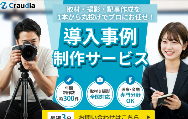 年間300件超の導入事例を制作する代行サービス。全国取材・撮影に対応し、医療・IT・金融など専門性の高い業界でも安心。企画設計から執筆・撮影・デザイン調整・Web公開まで一貫した支援が可能。記事はホワイトペーパーやメルマガ、営業資料へ再活用もお手伝いします。短期間で大量制作した実績も豊富で、リード獲得と商談創出を支援。