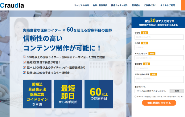 薬機法・景表法・医療広告ガイドラインを遵守し、最短即日着手が可能な医療ライティング/医師監修サービス。60を超える診療科目を含む350名以上の医師・医療ライターネットワークや、1,000件以上の対応実績をベースとした安全・信頼性の高いコンテンツを提供し、医療コンテンツの品質向上と成果創出を支援します。