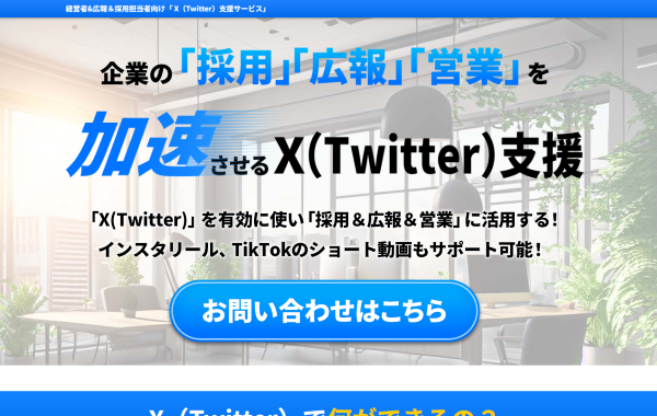 X(Twitter)、インスタ、TikTokのコンサル、運用代行を行います。強みは実際にSNSを伸ばし、ビジネス活用ができてることです。経営者、フリーランス、公式アカウントまで幅広く対応しています。