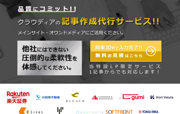 メディア運営20年以上で培った運営ノウハウを活かし、SEO戦略設計から取材・執筆・編集・入稿までワンストップで支援する記事制作代行サービスです。自社の人材リソース提供事業を通じて、専門ライターや編集者などの人材がプロジェクト毎に最適なチームを構成。医療・不動産・金融など専門ジャンルにも対応し、コンテンツ制作を行います。