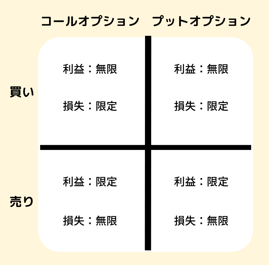 オプション取引は、コールオプションあるいはプットオプションを「売る」ときに、利益が限定され、損失が実質無限になります。