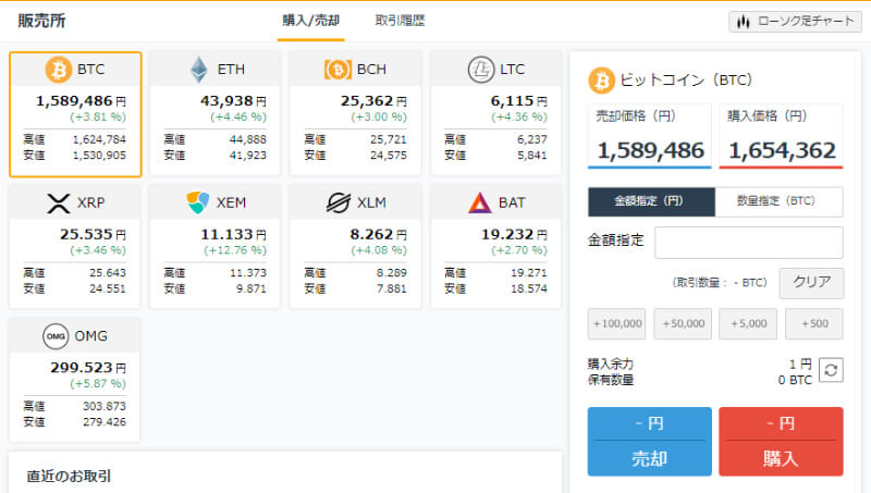 | 「販売所」取扱通貨 | BTC、XRP、ETH、XLM、XEM、BAT、LTC、BCH、OMG |